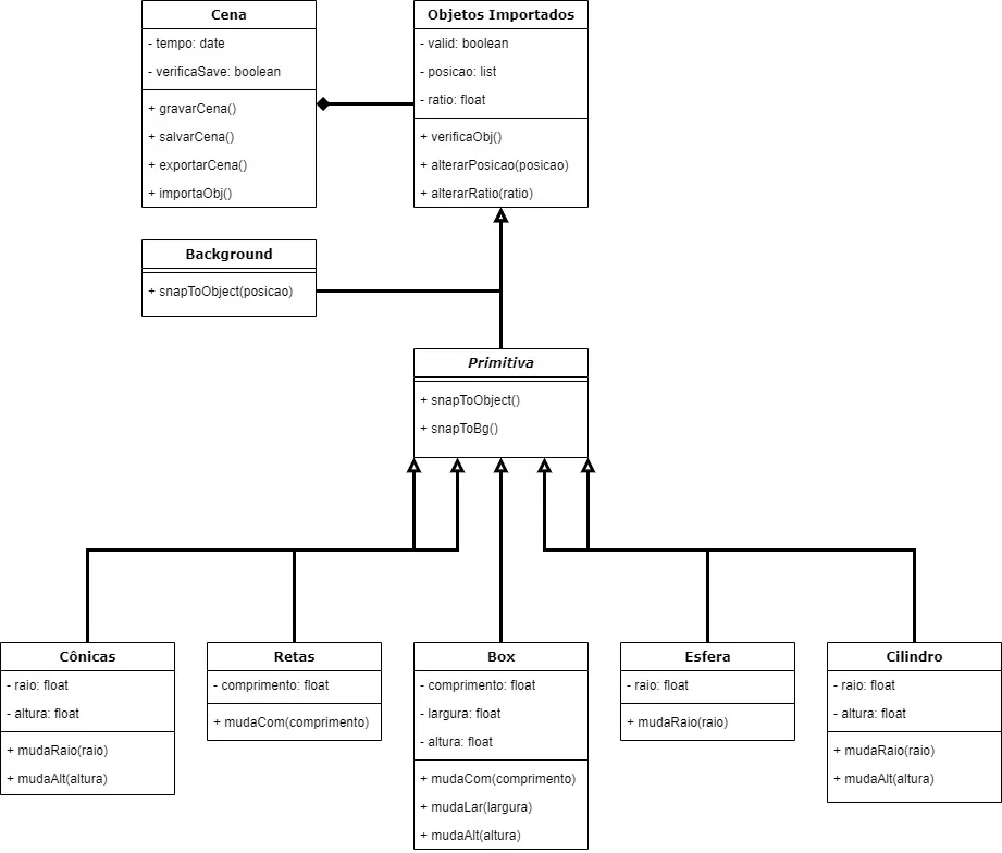 Da forma como imaginei o software, temos Cena como uma superclasse que pode conter Objetos. Esses objetos podem ser do tipo Background ou Primitiva (superclasse que engloba todas as formas geométricas).
